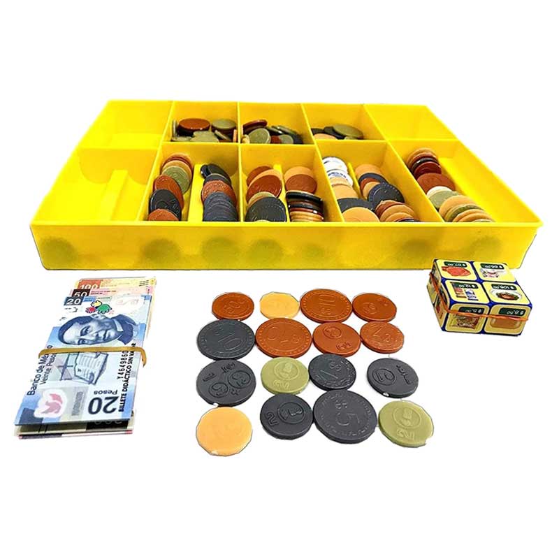 Kit de billetes, monedas y dados ilustrados que permiten al niño ejercitar las operaciones básicas de una manera muy real al estar sumando y restando en un divertido juego de compra y venta de artículos de uso cotidiano.