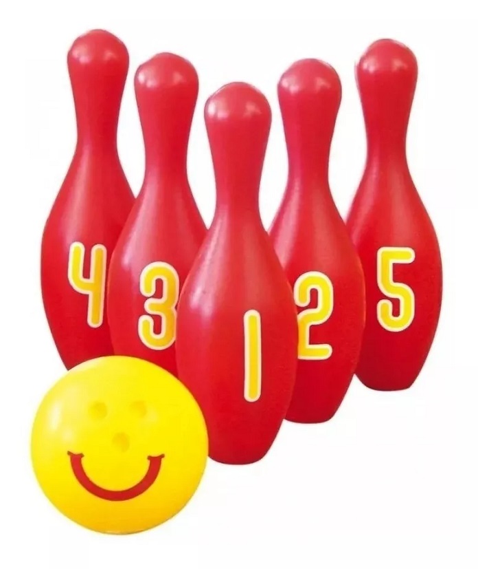 Útil en la coordinación ojo-mano, en actividades físicas, práctica matemática al sumar o restar los números impresos. Nota: Los colores de los boliches puede variar.