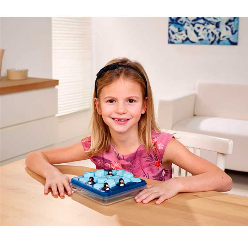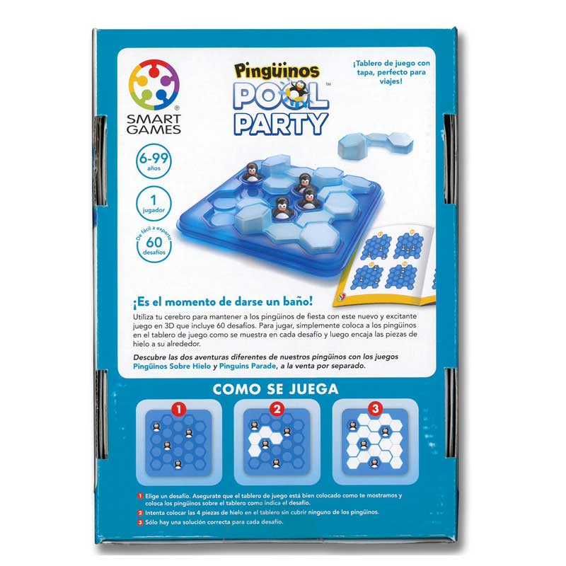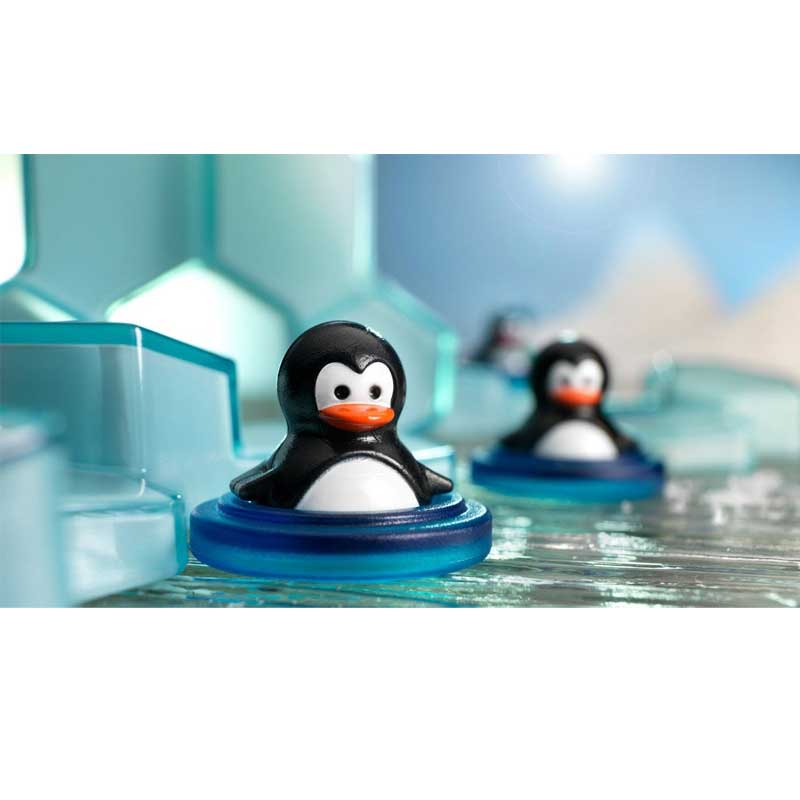 4 Pingüinos. 4 Témpanos de hielo. 1 Folleto con 60 desafíos. Medidas de la caja: 17 x 24 x 5 cm.